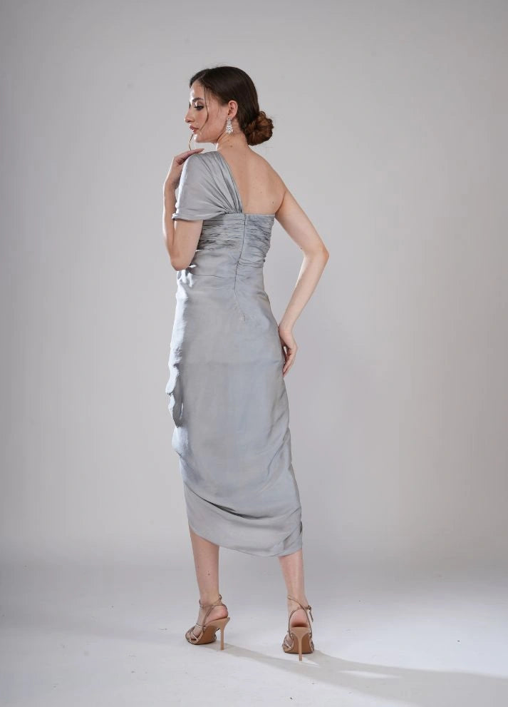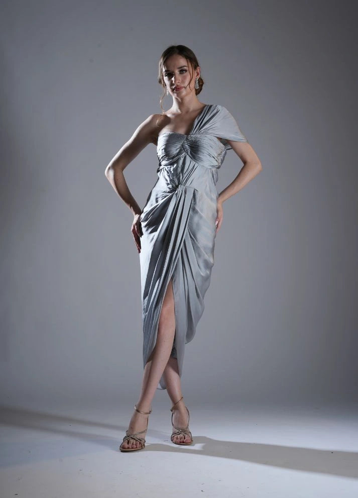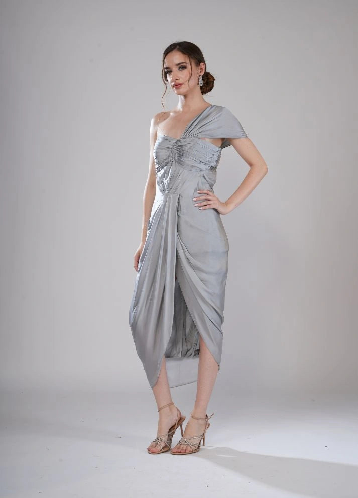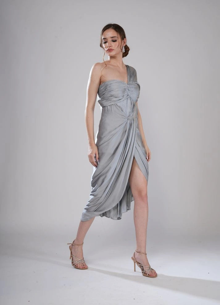 A grey dress featuring an asymmetric one-shoulder design with a draped bodice, fitted silhouette, and an asymmetrical skirt with a high slit. The combination of structure and fluidity creates a unique and stylish silhouette, perfect for any event.