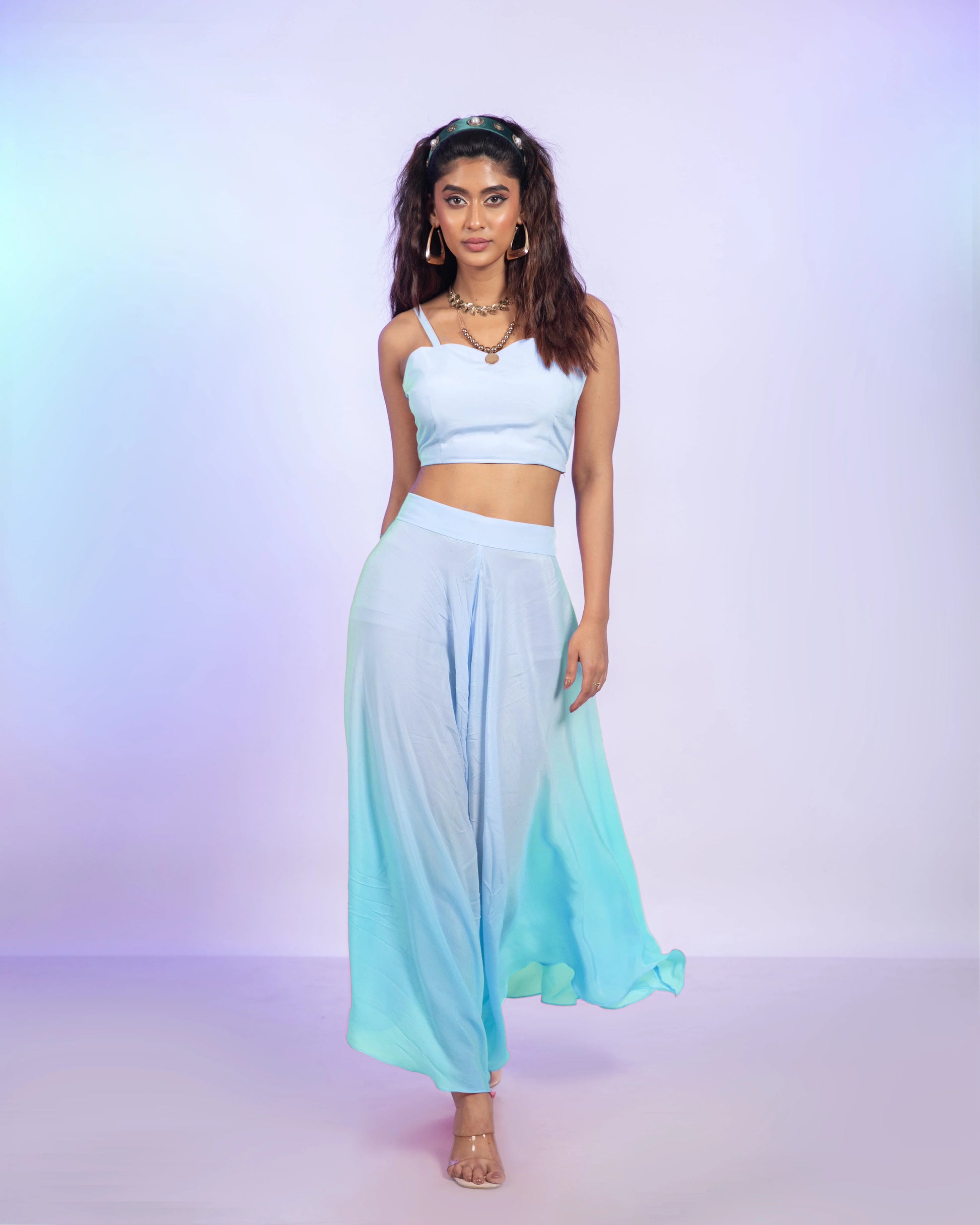 Channel your inner free spirit with this boho-chic co-ord set, featuring a flattering crop top and ombre blue draped flared pants. The pants, made from breezy crepe, flow effortlessly with every step, creating a dreamy, relaxed silhouette. The ombre tones bring a touch of playful charm, making this set your go-to for everything from music festival days to sunset beach strolls. Perfect for those who live life in full color and fluid motion!
