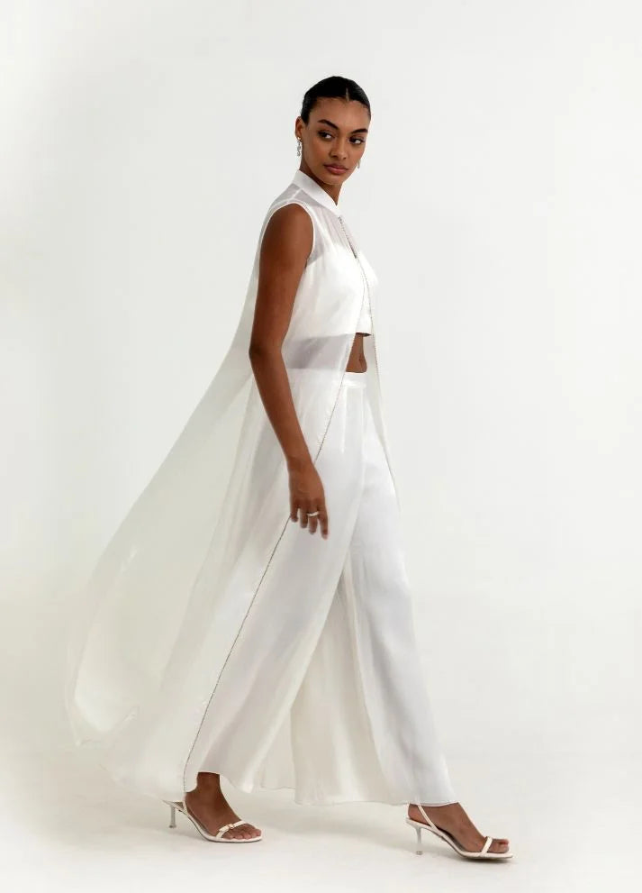 A whisper of tradition reimagined for the modern muse. This ensemble pairs a sheer mandarin-collared overlay with a sculpted bandeau and flowing white trousers, offering a study in graceful contrast. The delicate translucence reveals and conceals in perfect measure, while crystal accents catch the light with quiet elegance. A sublime choice for sunlit celebrations or contemporary ceremonial dressing—serene, sculptural, and impossibly refined.