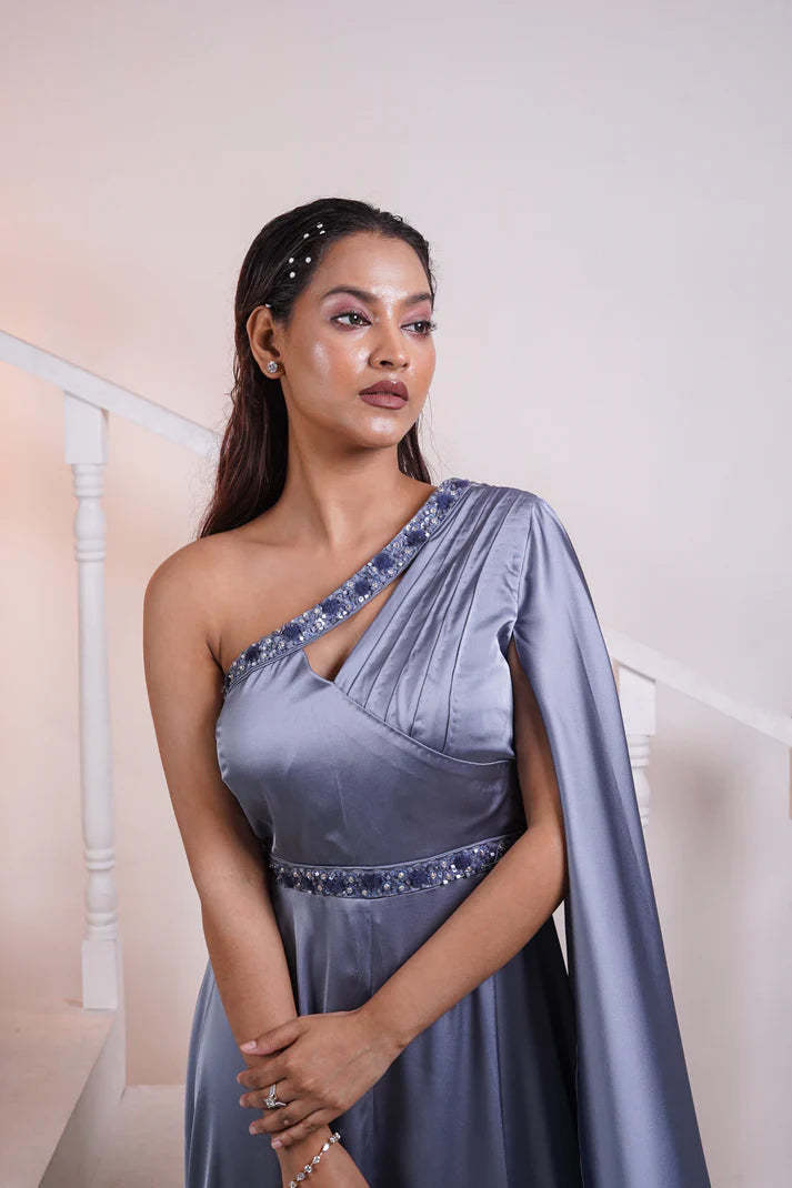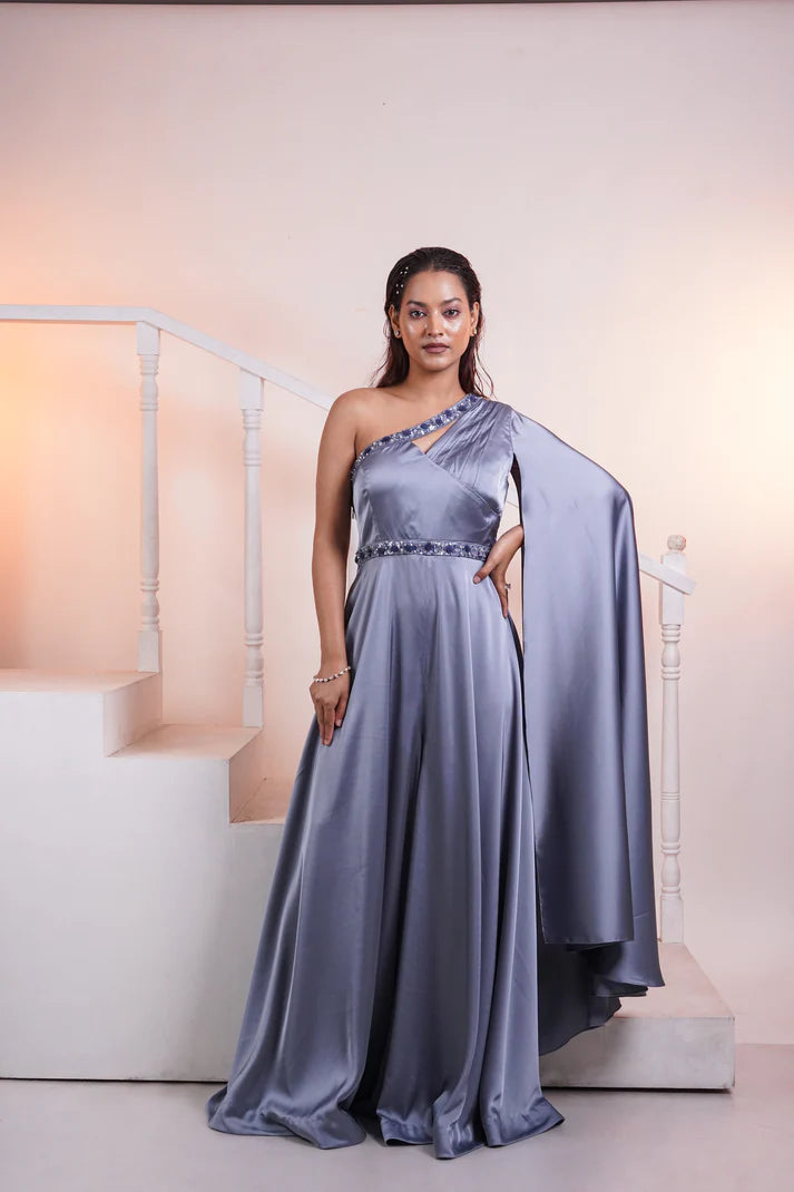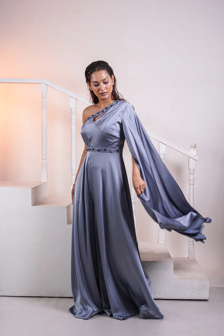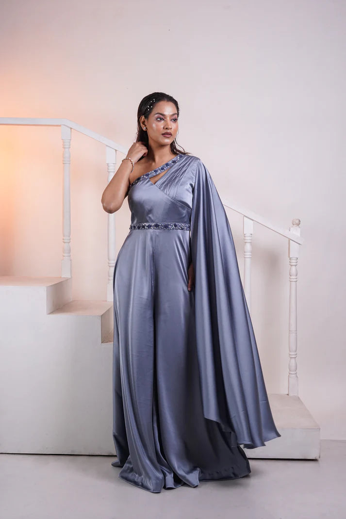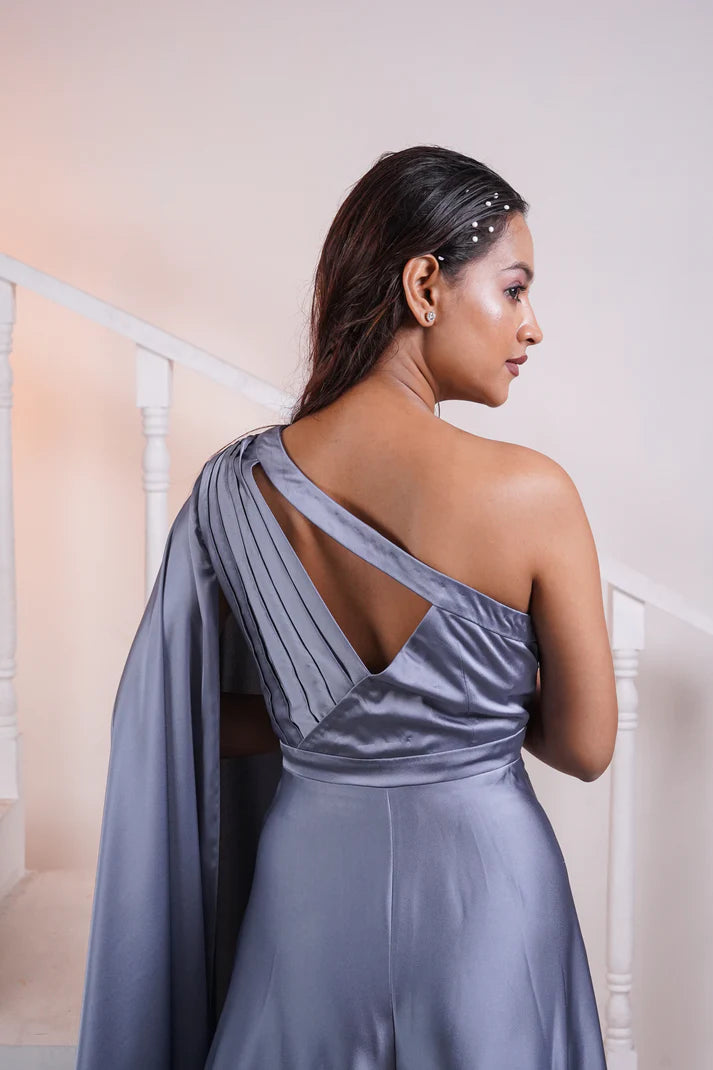 A slate grey one-shoulder draped jumpsuit with a pleated back, embellished neckline, and flowing cape sleeve — dramatic yet refined.