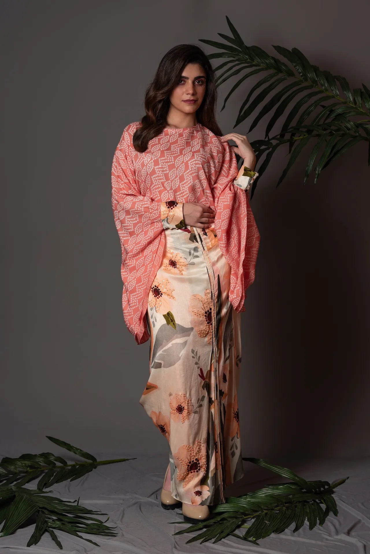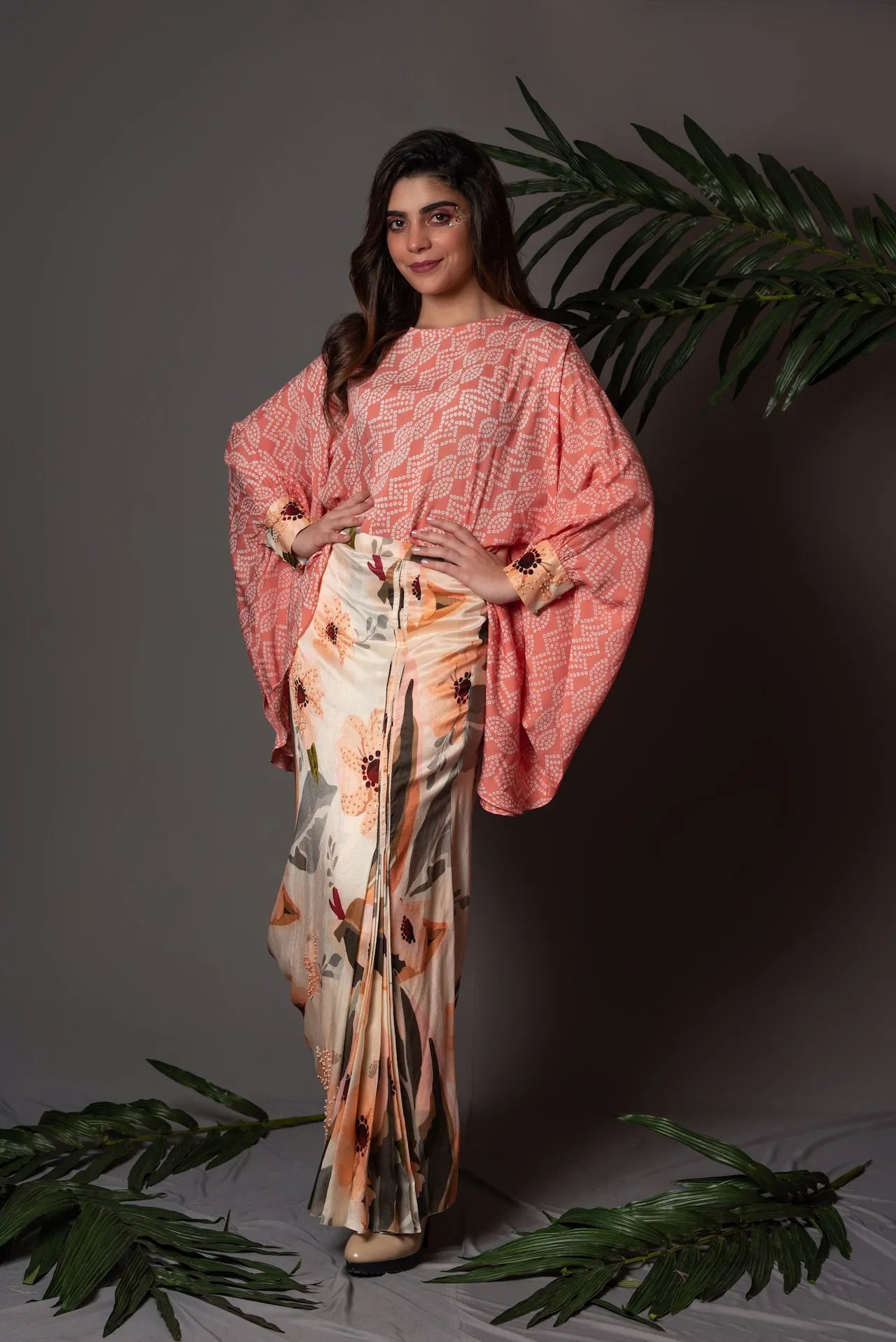 Featuring a bandhani kaftaan top in silky muslin base paired with a floral printed draped skirt in satin base.