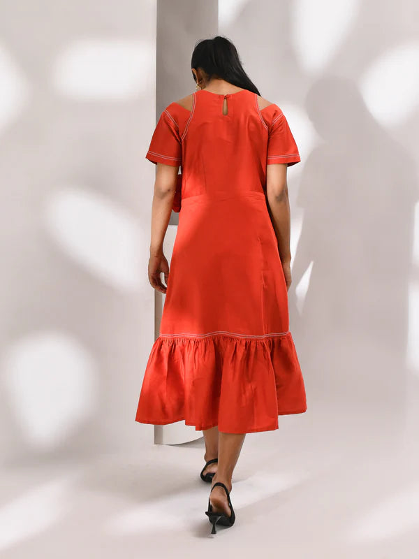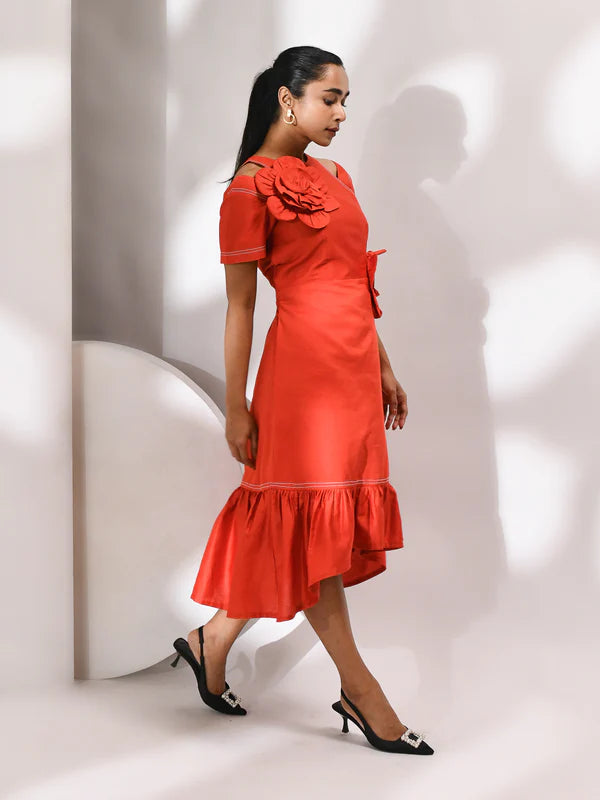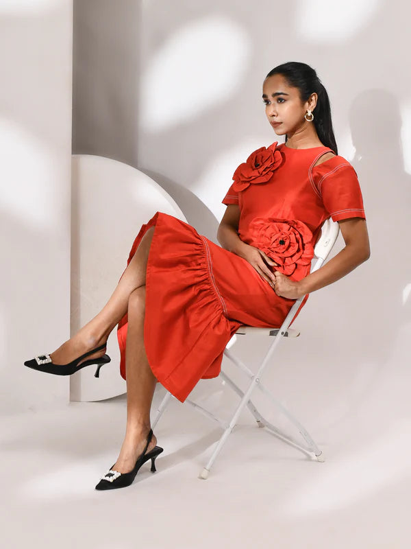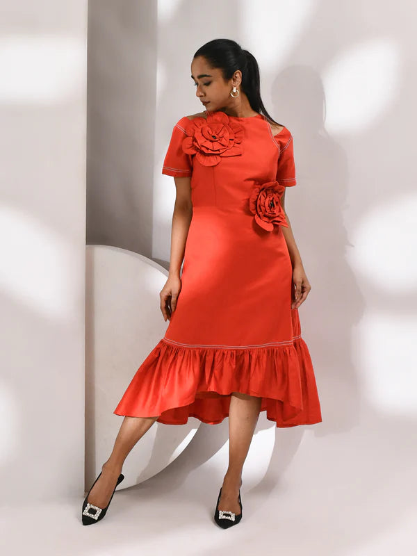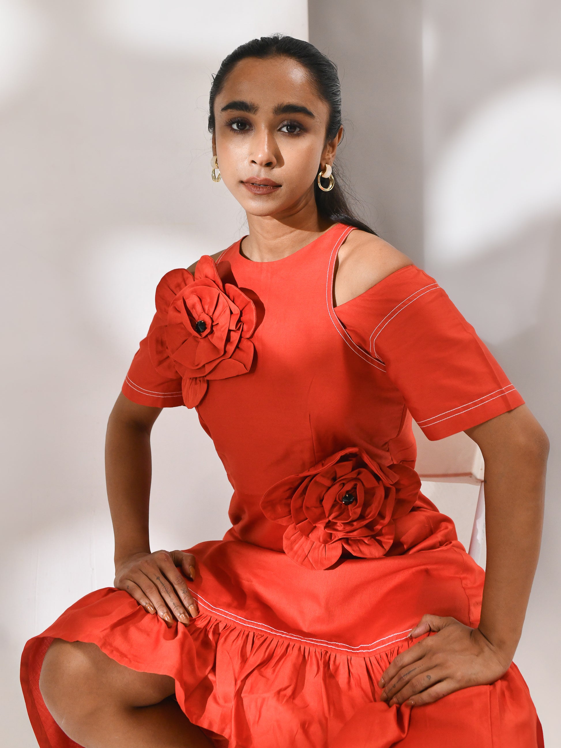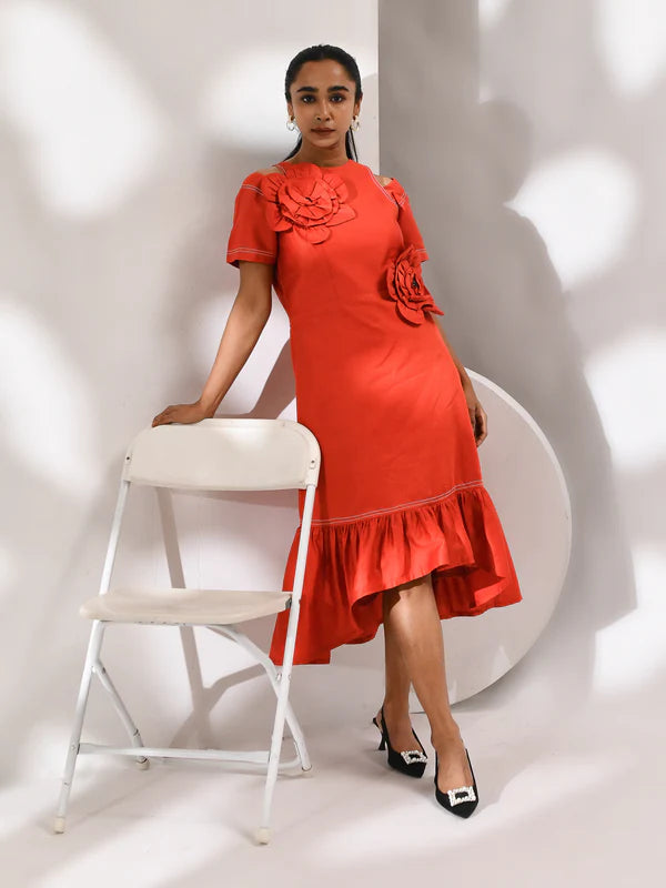 A radiant ode to fearless elegance, the Tangerine Bloom dress turns heads with its asymmetric silhouette and artful floral patchwork. The vibrant orange hue pulses with energy, while shoulder cutouts add a hint of rebellion to its romantic spirit. Crafted for the woman who blooms unapologetically, this piece dances between structure and spontaneity—perfect for sunlit occasions, festive soirées, or moments that call for bold beauty.