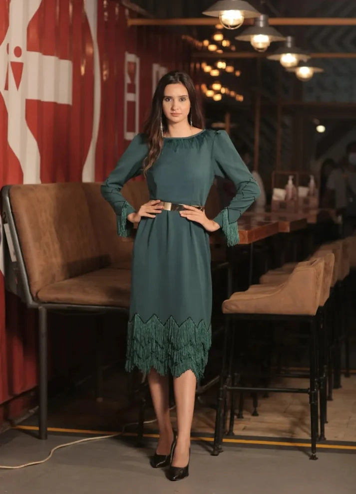 Need a wardrobe refresh? This Mid Sheath Dress with its playful fringed hem and delicate embellished sleeves adds a dynamic touch to classic silhouettes.