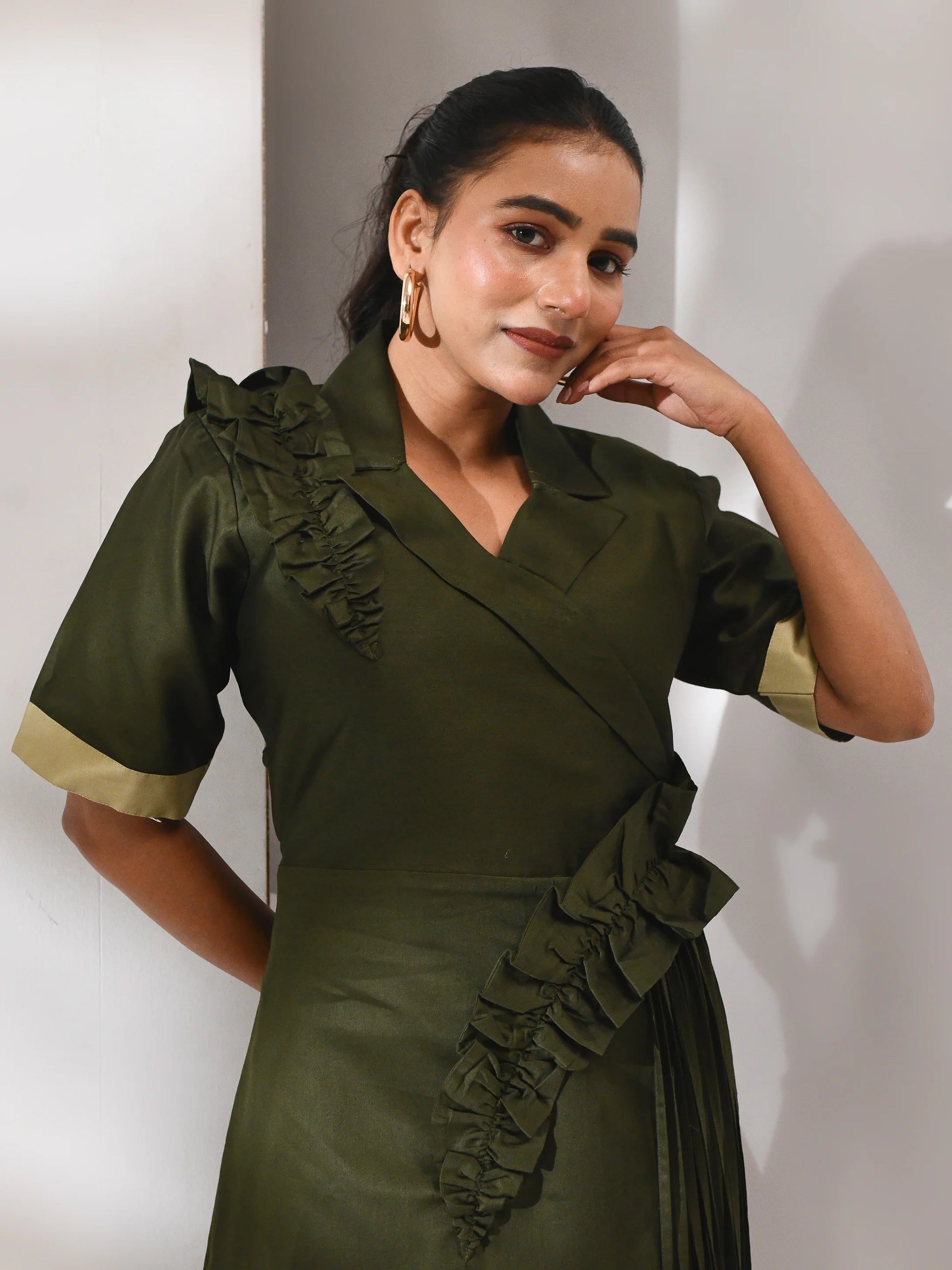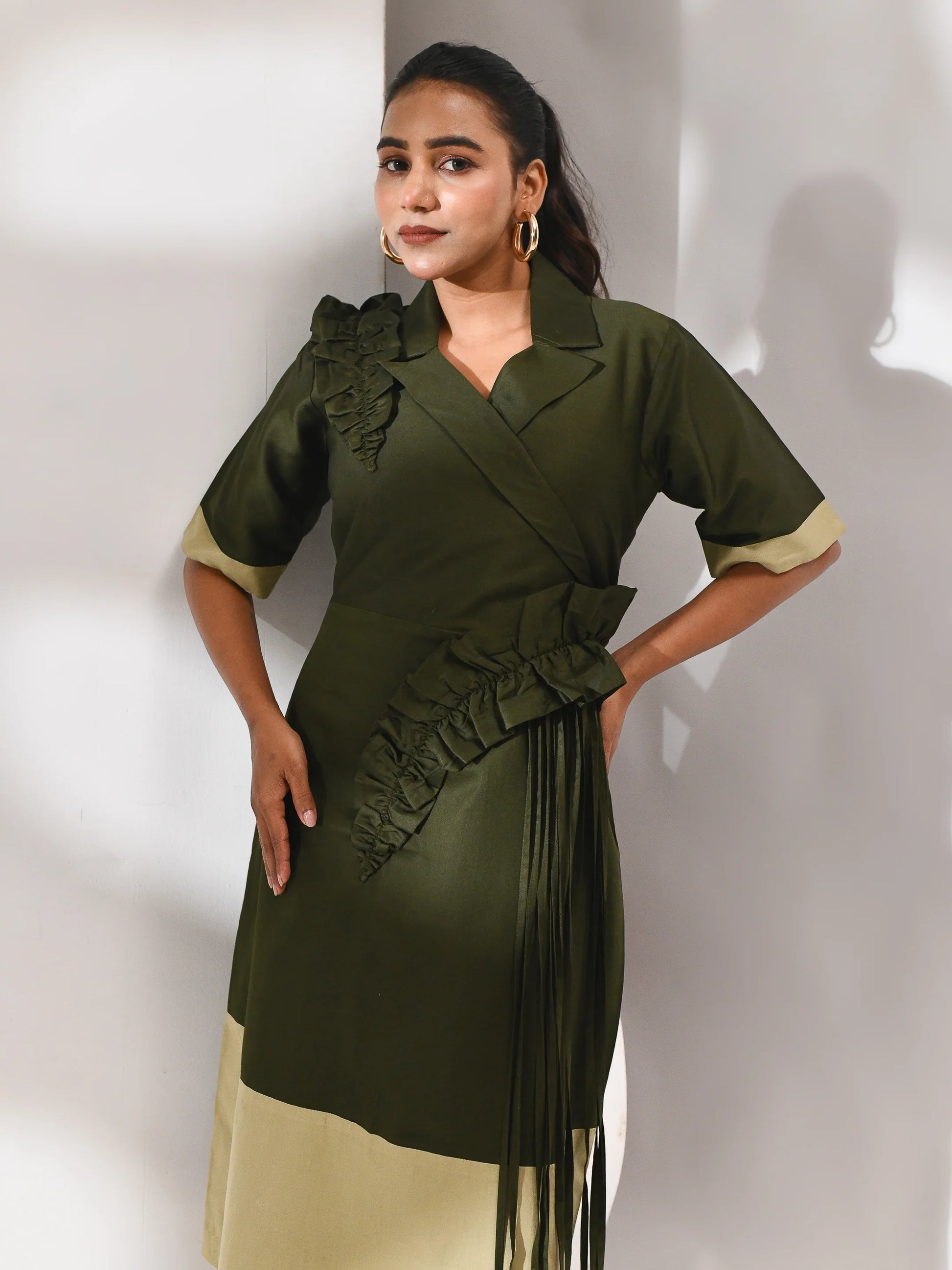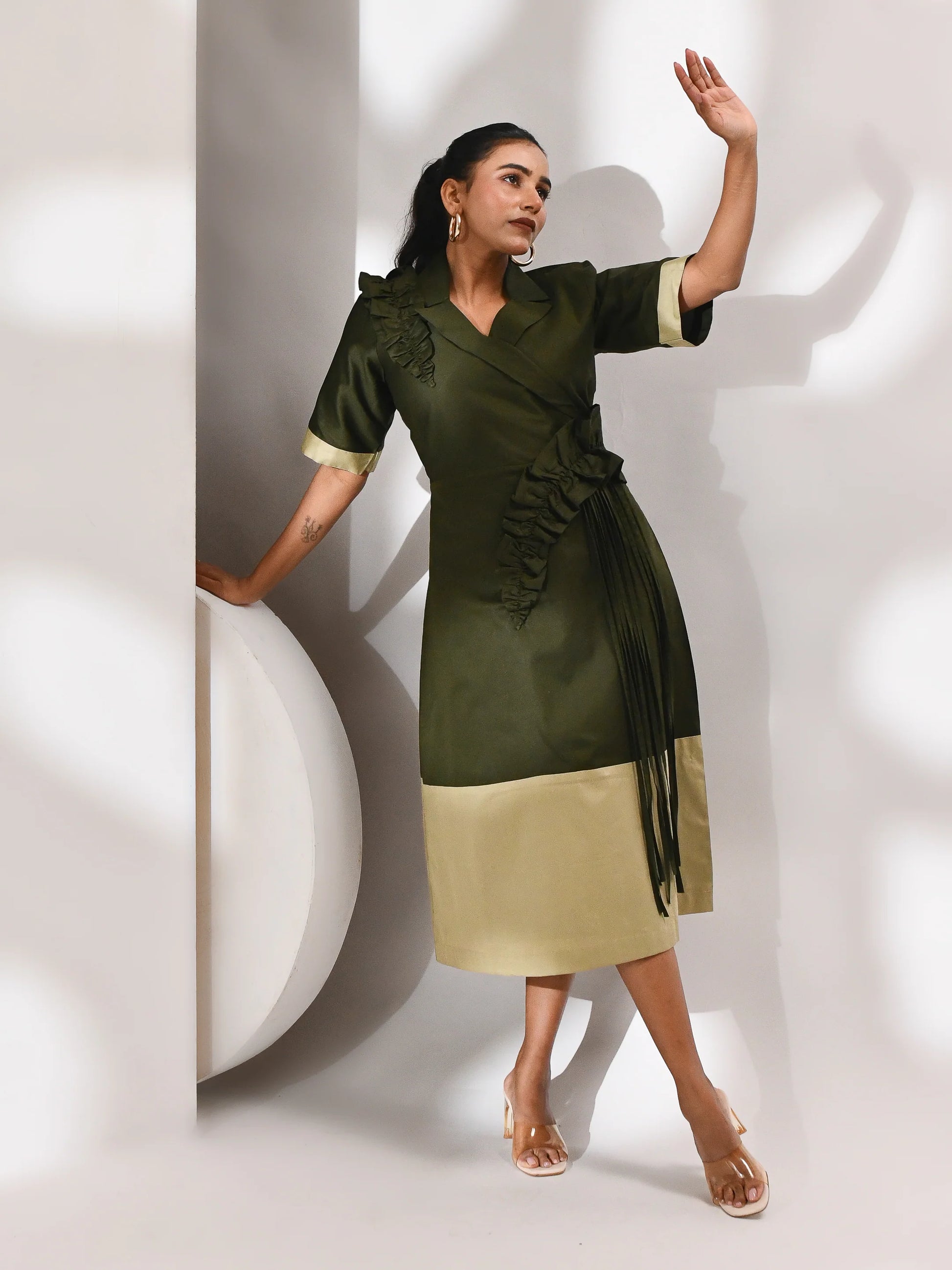 A stunning dress that features elegant ruched pleating and playful tassel details. This dress combines texture and movement, creating a dynamic and fashionable look.