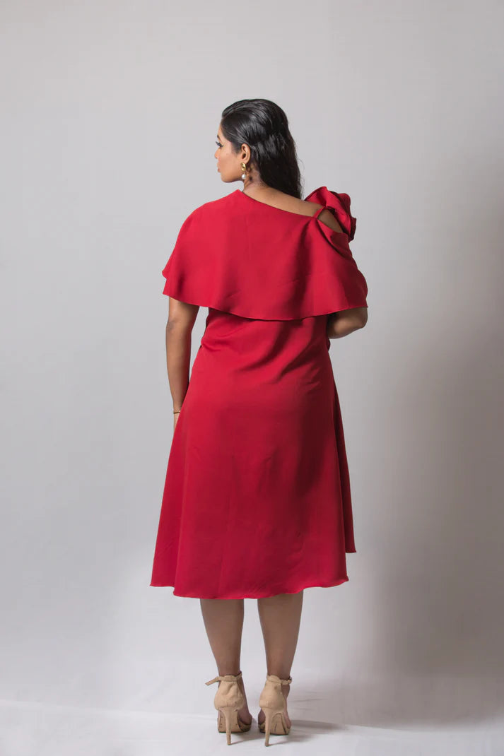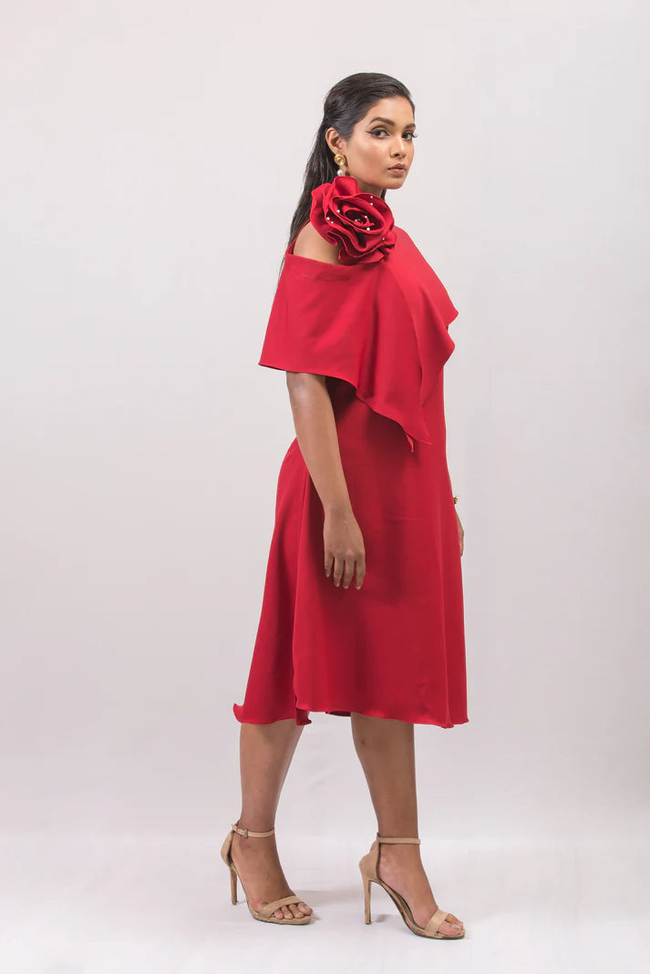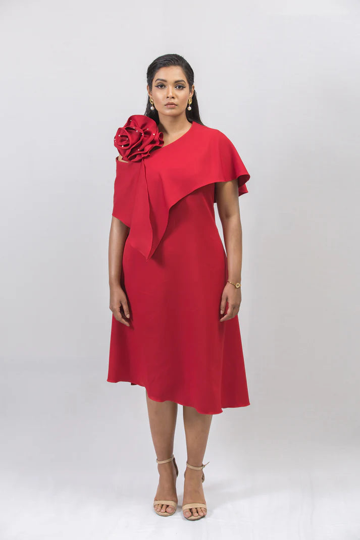 Make a bold style statement in this elegant one-shoulder red midi dress, crafted from luxurious heavy crepe fabric for a structured yet fluid drape. Designed with a flattering A-line silhouette, it flows gracefully while offering all-day comfort. The asymmetrical overlay adds modern sophistication, while the handcrafted 3D rose detail on the shoulder brings couture-inspired drama. Falling just below the knee, this standout dress is ideal for cocktail parties, evening gatherings, or any special occasion where you want to exude timeless elegance.