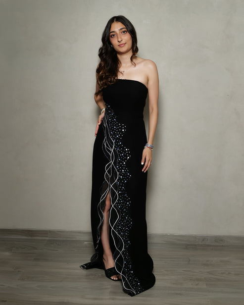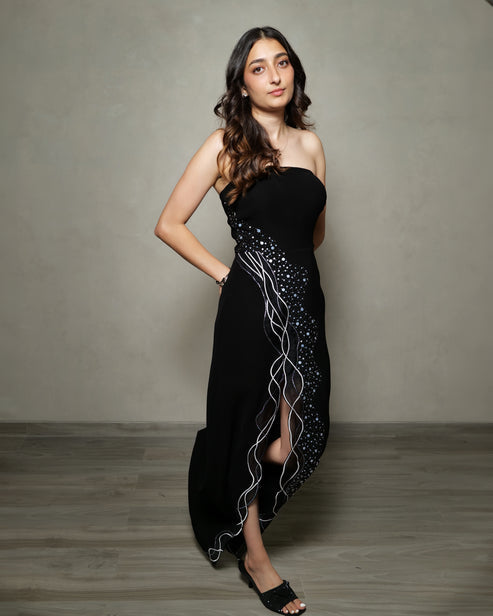 With the Party Season approaching, this off-shoulder slit maxi is your new confidence booster. The jet black gown, DNA-like embroidered detailing and cutwork sheer organza placement elevate your look with ease!