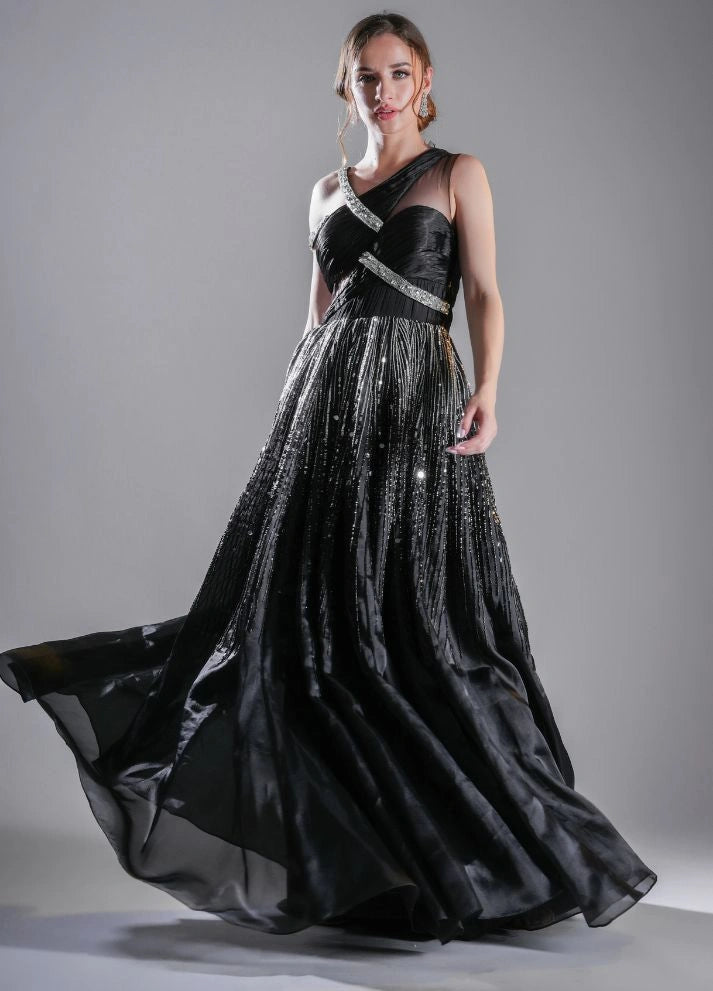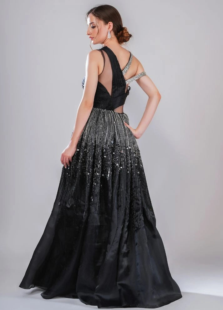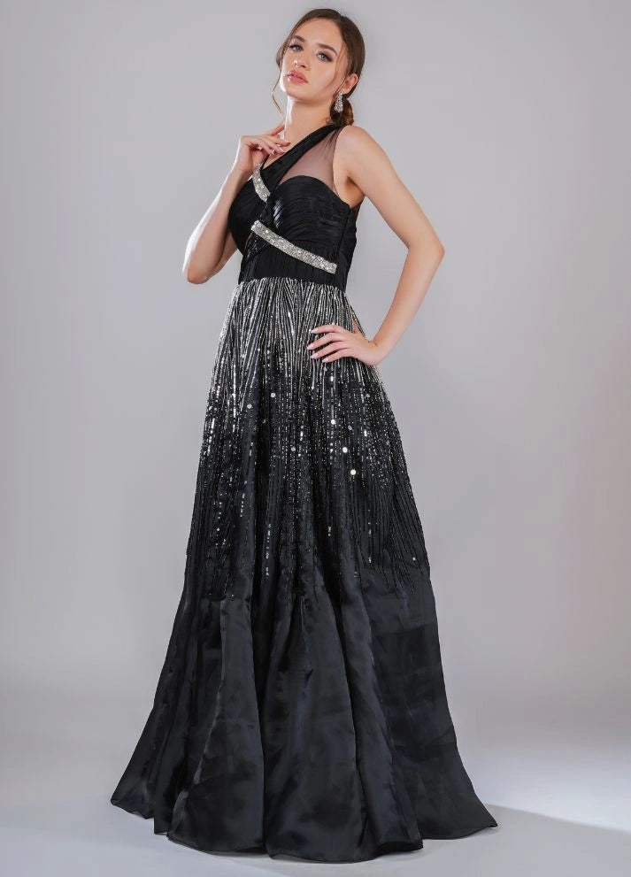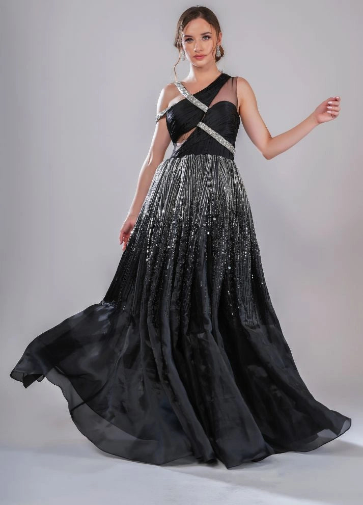 A black gown featuring an asymmetrical neckline with interwoven straps and a voluminous pleated skirt. The ombre effect from shimmering silver to deep black is filled with glistening beads and sequins, making it a thought-provoking statement piece.