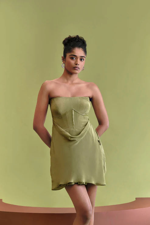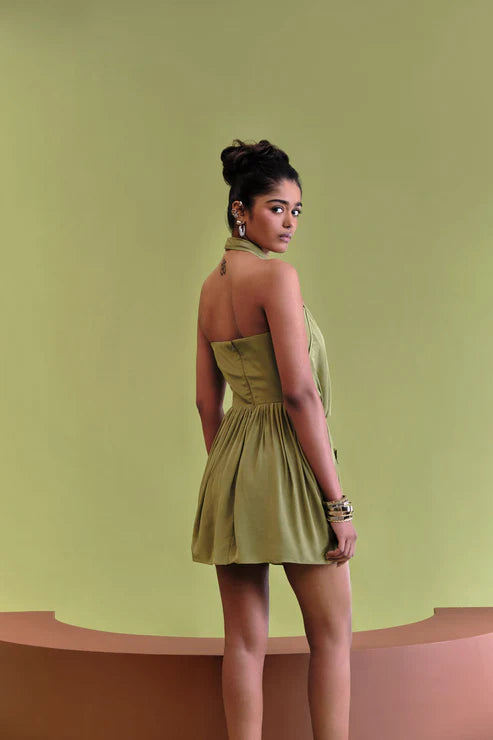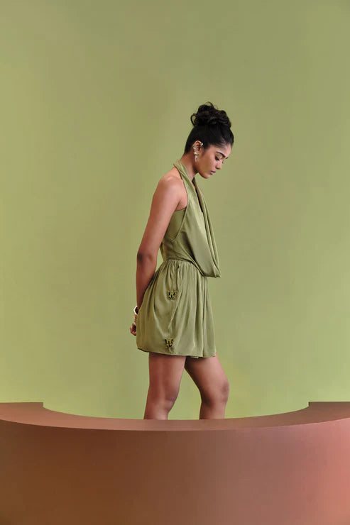 Introducing the transformative essence of our AW25 collection, Transform cowl mini Crafted from fluid crepe, this mini dress features an elegant draped cowl neckline that contrasts sharply with a structured, hidden internal corset top. The entire piece flows into a voluminous flared skirt, detailed with delicate, hand-stitched embroidered butterflies and playful tassels for an utterly charming finish.